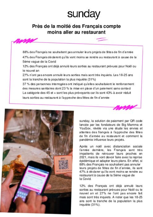 Sunday, la solution de paiement par QR code lancée par les fondateurs de Big Mamma et YouGov, révèle via une étude les envies et attentes des français à l’approche des fêtes de fin d’année au restaurant et comment la pandémie influence leurs projets.