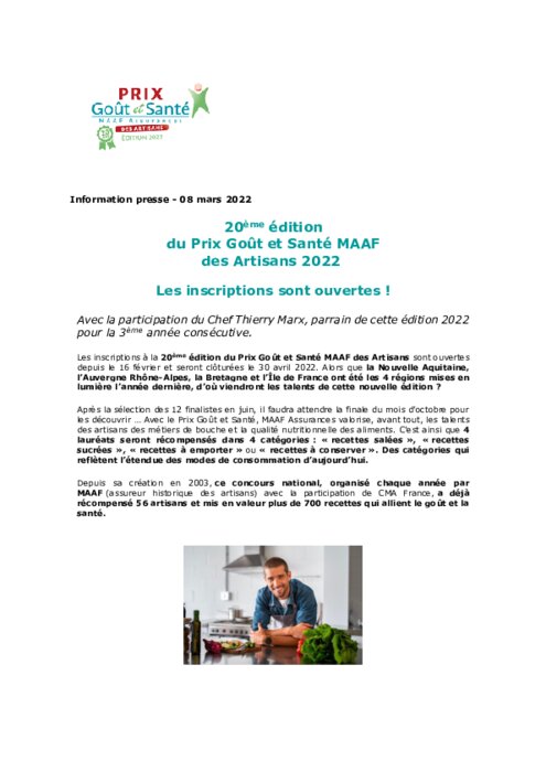 Prix Goût & Santé MAAF des artisans 2022 : les inscriptions sont ouvertes