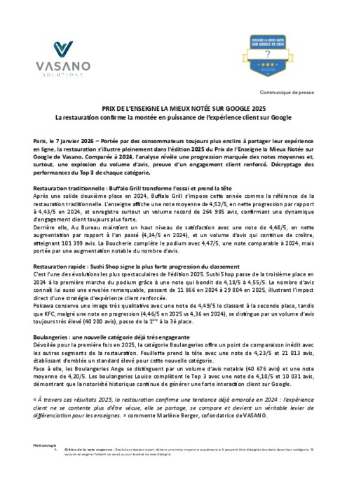 Portée par des consommateurs toujours plus enclins à partager leur expérience en ligne, la restauration s’illustre pleinement dans l’édition 2025 du Prix de l’Enseigne la Mieux Notée sur Google de Vasano. Comparée à 2024, l’analyse révèle une progression marquée des notes moyennes et, surtout, une explosion du volume d’avis, preuve d’un engagement client renforcé. Décryptage des performances du Top 3 de chaque catégorie.
