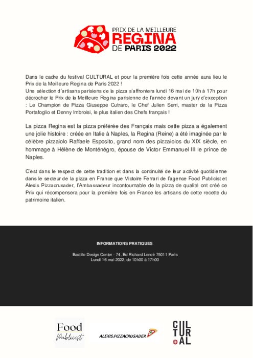 Une sélection d’artisans parisiens de la pizza s’affrontera lundi 16 mai de 10h à 17h pour décrocher le Prix de la Meilleure Regina parisienne de l’année devant un jury d’exception : Le Champion de Pizza Giuseppe Cutraro, le Chef Julien Serri, master de la Pizza Portafoglio et Denny Imbroisi, le plus italien des Chefs français.