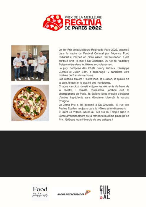 Le 1er Prix de la Meilleure Regina de Paris 2022, organisé dans le cadre du Festival Cultural par notre agence et l'expert en pizza Alexis Pizzacrusader, a été attribué lundi 16 mai à Da Giuseppe, 76 rue du Faubourg Poissonnière dans le 10ème arrondissement.