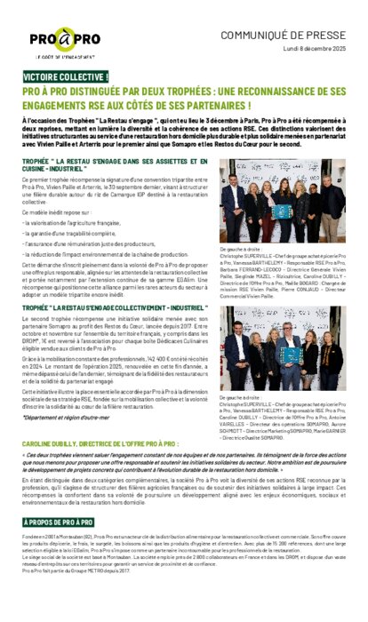 À l'occasion des Trophées " La Restau s'engage ", qui ont eu lieu le 3 décembre à Paris, Pro à Pro a été récompensée à deux reprises, mettant en lumière la diversité et la cohérence de ses actions RSE. Ces distinctions valorisent des initiatives structurantes au service d'une restauration hors domicile plus durable et plus solidaire menées en partenariat avec Vivien Paille et Arterris pour le premier ainsi que Somapro et les Restos du Cœur pour le second.
