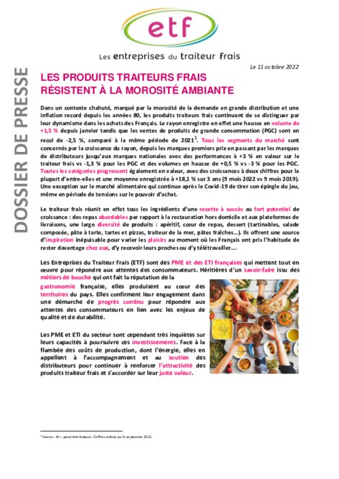 Fournisseurs 11 octobre 2022 - 15:06 Dans un contexte chahuté, marqué par la morosité de la demande en grande distribution et une inflation record depuis les années 80, les produits traiteurs frais continuent de se distinguer par leur dynamisme dans les achats des Français. PDF (2 Mo) Télécharger