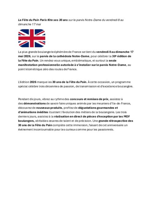 La plus grande boulangerie éphémère de France se tient du vendredi 8 au dimanche 17 mai, sur le parvis de la cathédrale Notre-Dame, pour célébrer la 30ᵉ édition de la Fête du Pain. Un rendez-vous unique, emblématique, et surtout la seule manifestation professionnelle autorisée à s’installer sur le parvis Notre-Dame, au point kilométrique zéro des routes de France.