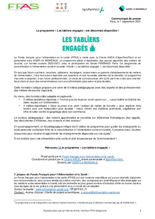 Métiers 07 septembre 2021 - 09:24 Dans le cadre du déploiement du programme « Les tabliers engagés » visant à sensibiliser les jeunes apprentis des métiers de bouche à une alimentation plus saine et plus durable. PDF (267 Ko) Télécharger