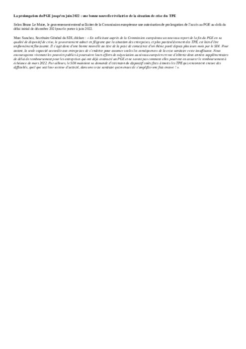 Métiers 08 novembre 2021 - 13:45 Selon Bruno Le Maire, le gouvernement entend solliciter de la Commission européenne une autorisation de prolongation de l’accès au PGE au-delà du délai initial de décembre 2021pour le porter à juin 2022. PDF (124 Ko) Télécharger