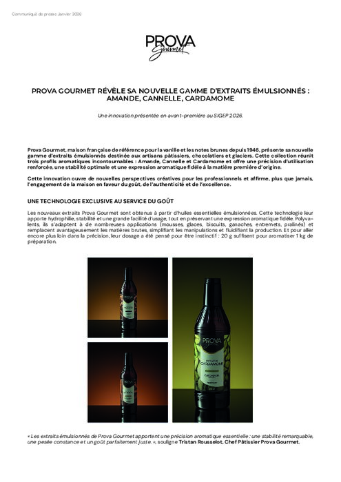 À l’occasion du SIGEP 2026, Prova Gourmet dévoile en avant-première une nouvelle gamme d’extraits émulsionnés destinée aux artisans pâtissiers, chocolatiers et glaciers. Déclinés en Amande, Cannelle de Ceylan et Cardamome, ces extraits reposent sur une technologie exclusive d’huiles essentielles émulsionnées, garantissant une stabilité optimale, une grande précision de dosage (20 g/kg) et une expression aromatique fidèle à la matière première. Pensée comme un véritable outil créatif pour les professionnels, cette innovation illustre l’engagement historique de Prova Gourmet en faveur du goût juste, de l’authenticité et de l’excellence aromatique.