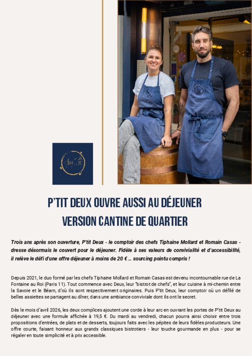 Trois ans après son ouverture, P’tit Deux - le comptoir des chefs Tiphaine Mollard et Romain Casas - dresse désormais le couvert pour le déjeuner. Fidèle à ses valeurs de convivialité et d’accessibilité, il relève le défi d’une offre déjeuner à moins de 20 € ... sourcing pointu compris !