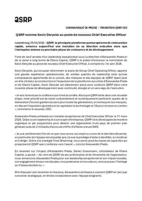 Forte de neuf années d’un leadership exceptionnel sous la direction d’Alessandro Preda et de la vision à long terme de Kharis Capital, QSRP a le plaisir d’annoncer la nomination de Kevin Derycke au poste de nouveau chief executive officer, à compter du 1er avril.