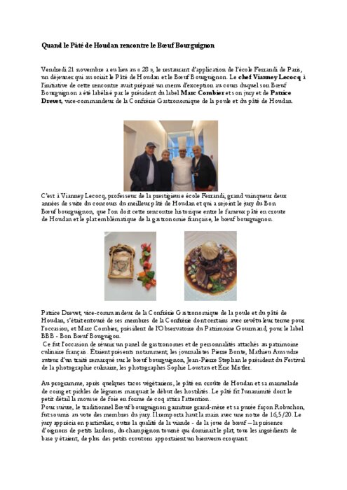 Vendredi 21 novembre a eu lieu au « 28 », le restaurant d’application de l’école Ferrandi de Paris, un déjeuner qui associait le Pâté de Houdan et le Bœuf Bourguignon. Le chef Vianney Lecocq à l’initiative de cette rencontre avait préparé un menu d’exception au cours duquel son Bœuf Bourguignon a été labélisé par le président du label Marc Combier et son jury et de Patrice Drevet, vice-commandeur de la Confrérie Gastronomique de la poule et du pâté de Houdan.