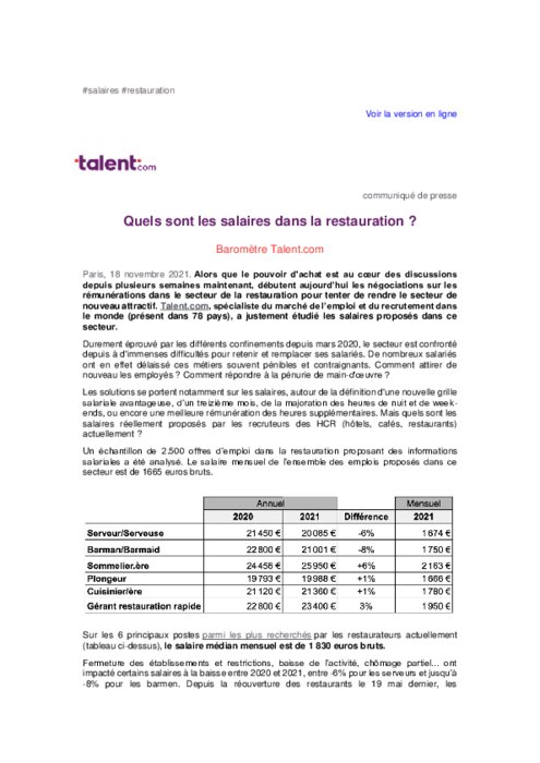 Quels sont les salaires dans la restauration ? (Baromètre Talent.com)