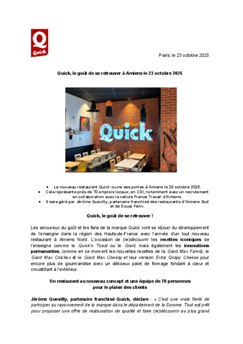 Le nouveau restaurant Quick d’Amiens Nord dispose de 194 places assises, dont 134 en salle et 60 en terrasse. Il affiche le dernier décor de l’enseigne, en phase avec la nouvelle identité de marque. Couleurs vives, panneaux lumineux et néons rouges apportent une signature forte que les amoureux du goût reconnaitront immédiatement. A l’intérieur, murs en briques et matières chaleureuses plongent les fans du Giant dans une ambiance à la fois conviviale et urbaine. Un « Story Wall » illustre les quelques 45 ans d’histoire de l’enseigne, et des cadres disposés dans l’ensemble du restaurant retracent les étapes clés de la vie de Quick.