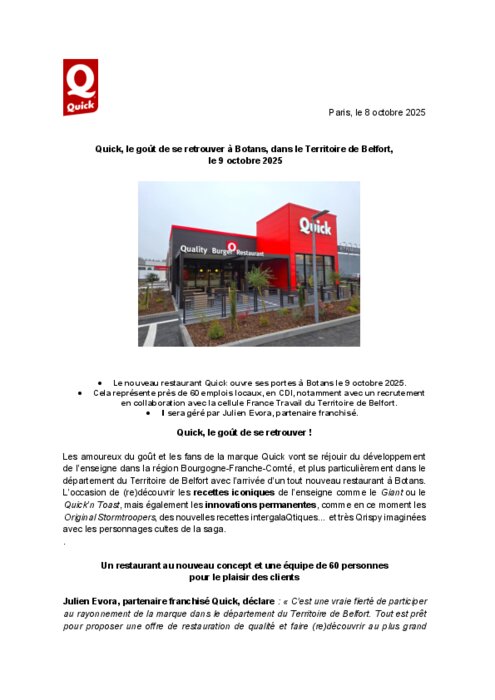 Le nouveau restaurant Quick ouvre ses portes à Botans le 9 octobre. Cela représente près de 60 emplois locaux, en CDI, notamment avec un recrutement en collaboration avec la cellule France Travail du Territoire de Belfort. Il sera géré par Julien Evora, partenaire franchisé.