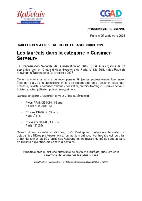 Métiers 26 septembre 2025 - 05:05 La Confédération Générale de l’Alimentation en Détail (CGAD) a organisé, le 24 septembre dernier, Cirque d’Hiver Bouglione de Paris, la 13e édition des Rabelais des Jeunes Talents de la Gastronomie 2025. PDF (311 Ko) Télécharger crédit photo : cedric-doux.fr / Vikensi Communication /CGAD