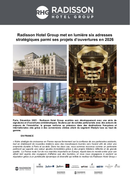Radisson Hotel Group accélère son développement avec une série de signatures et d’ouvertures emblématiques. Soutenu par de solides partenariats avec des acteurs de majeurs de l’immobilier, le groupe renforce sa présence dans des destinations françaises et internationales clés grâce à des conversions ciblées allant du segment lifestyle luxe au haut de gamme.