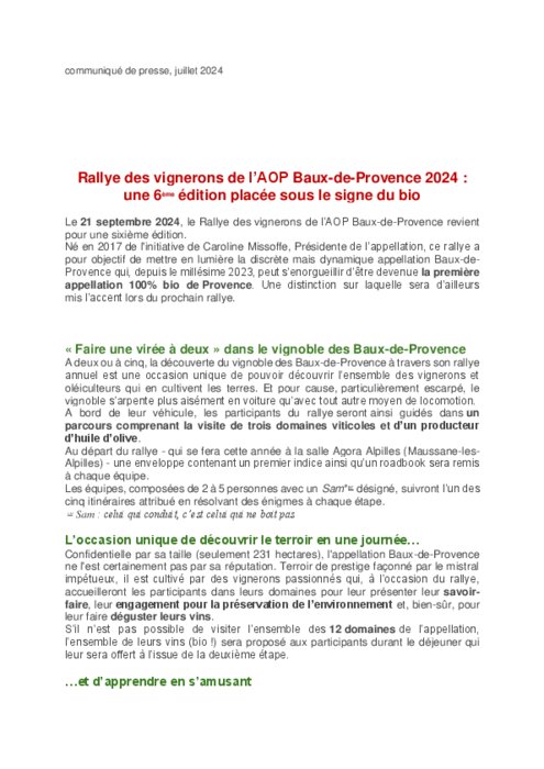 Le 21 septembre, le Rallye des vignerons de l’AOP Baux-de-Provence revient pour une sixième édition. Né en 2017 de l'initiative de Caroline Missoffe, Présidente de l’appellation, ce rallye a pour objectif de mettre en lumière la discrète mais dynamique appellation Baux-de-Provence qui, depuis le millésime 2023, peut s’enorgueillir d’être devenue la première appellation 100% bio de Provence. Une distinction sur laquelle sera d’ailleurs mis l’accent lors du prochain rallye.