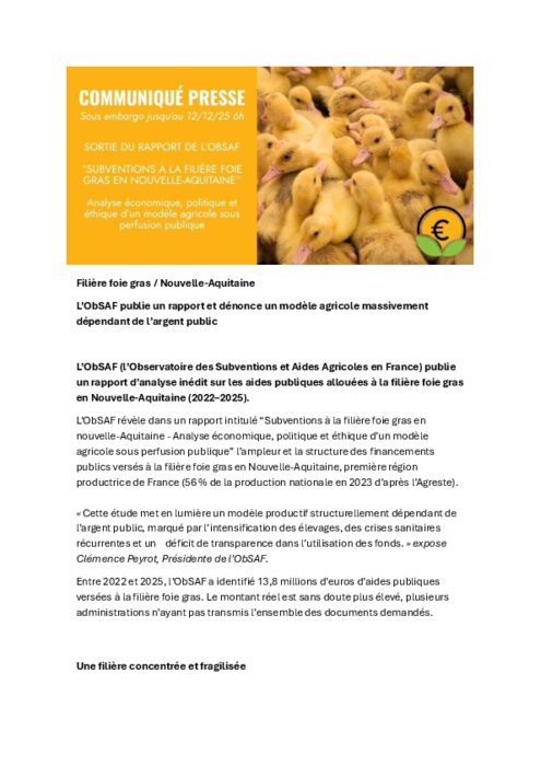 L’ObSAF révèle dans un rapport intitulé “Subventions à la filière foie gras en nouvelle-Aquitaine - Analyse économique, politique et éthique d’un modèle agricole sous perfusion publique” l’ampleur et la structure des financements publics versés à la filière foie gras en Nouvelle-Aquitaine, première région productrice de France (56 % de la production nationale en 2023 d’après l’Agreste).