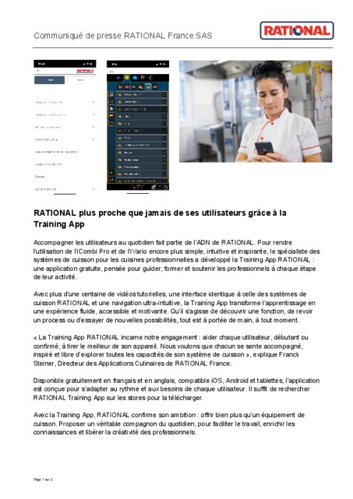 Accompagner les utilisateurs au quotidien fait partie de l’ADN de Rational. Pour rendre l’utilisation de l’iCombi Pro et de l’iVario encore plus simple, intuitive et inspirante, le spécialiste des systèmes de cuisson pour les cuisines professionnelles a développé la Training App Rational : une application gratuite, pensée pour guider, former et soutenir les professionnels à chaque étape de leur activité.