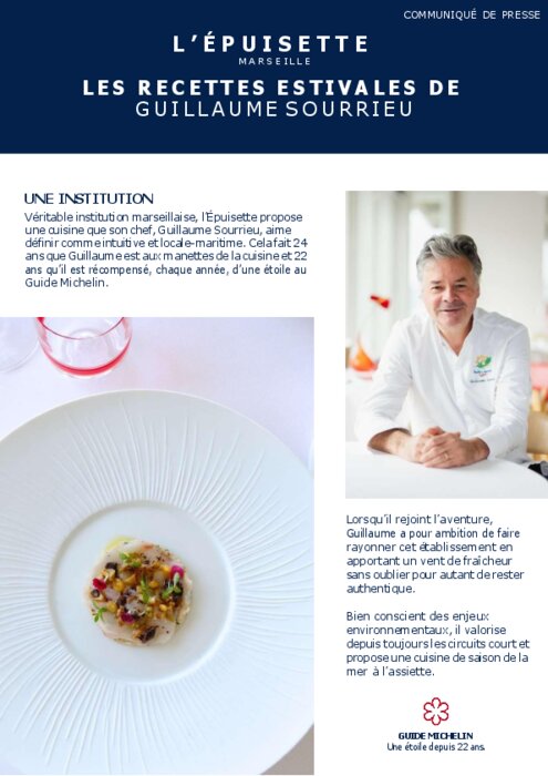 Véritable institution marseillaise, l’Épuisette propose une cuisine que son chef, Guillaume Sourrieu, aime définir comme intuitive et locale-maritime. Cela fait 24 ans que Guillaume est aux manettes de la cuisine et 22 ans qu’il est récompensé, chaque année, d’une étoile au Guide Michelin.