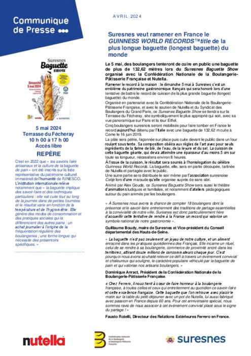 Le 5 mai, des boulangers tenteront de cuire en public une baguette de plus de 132,62 mètres lors du Suresnes Baguette Show organisé avec la Confédération Nationale de la Boulangerie- Pâtisserie Française et Nutella. Cinq boulangers suresnois seront mobilisés pour faire tomber en France le record aujourd’hui détenu par l’Italie avec une baguette de 132,62 m cuite à Come le 16 juin 2019.