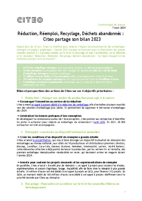 Réduction, Réemploi, Recyclage, Déchets abandonnés : Citeo partage son bilan 2023