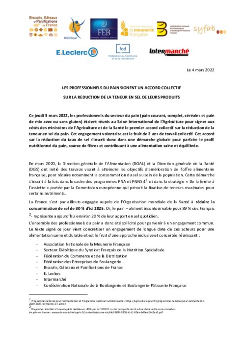 Les professionnels du secteur du pain (pain courant, complet, céréales et pain de mie avec ou sans gluten) étaient réunis au Salon International de l’Agriculture pour signer aux côtés des ministères de l’Agriculture et de la Santé le premier accord collectif sur la réduction de la teneur en sel du pain.