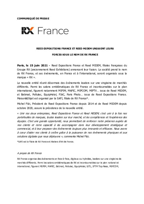 Reed Expositions France et Reed MIDEM, filiales françaises du Groupe RX (anciennement Reed Exhibitions) annoncent leur fusion