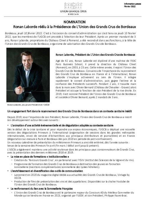 Le conseil d'administration de l'Union des Grands Crus de Bordeaux, qui s'est tenu ce jeudi 10 février 2022, a reconduit Ronan Laborde, propriétaire du Château Clinet à Pomerol, dans ses fonctions, à la tête de l'Union des Grands Crus de Bordeaux, organisme de valorisation des Grands Crus de Bordeaux. Ronan Laborde est le plus jeune Président de l'UGCB.