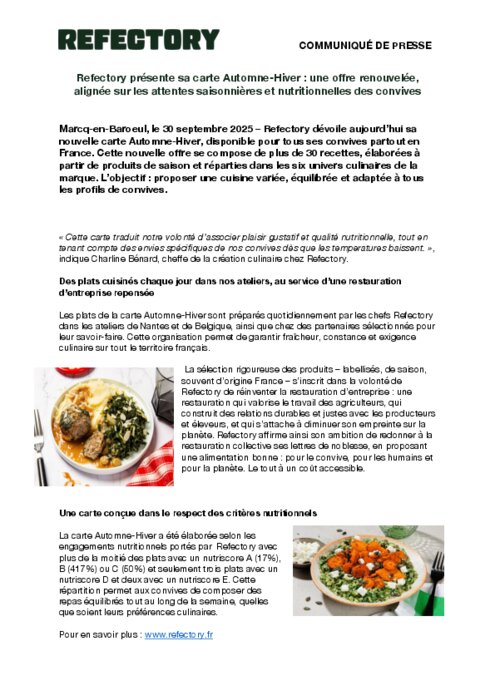 Les plats de la carte Automne-Hiver sont préparés quotidiennement par les chefs Refectory dans les ateliers de Nantes et de Belgique, ainsi que chez des partenaires sélectionnés pour leur savoir-faire. Cette organisation permet de garantir fraîcheur, constance et exigence culinaire sur tout le territoire français.
