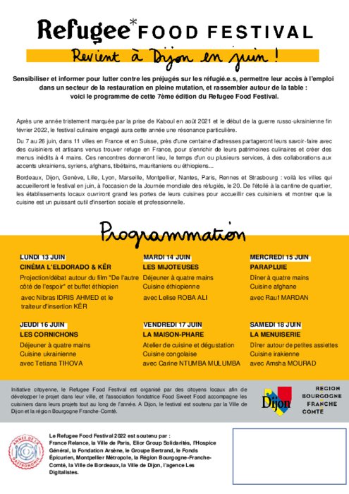 Métiers 18 mai 2022 - 15:51 Du 7 au 26 juin, près d'une centaine de restaurants et artisans partageront leurs savoir-faire avec des cuisiniers venus trouver refuge en France, pour créer des menus inédits à 4 mains. PDF (127 Ko) Télécharger
