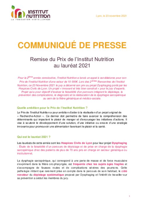 Métiers 07 décembre 2021 - 11:40 Le jury a décerné son prix au projet Dysphaging porté par les Hospices Civils de Lyon. Un projet « innovant et très bien construit » pour le jury d’experts. PDF (186 Ko) Télécharger