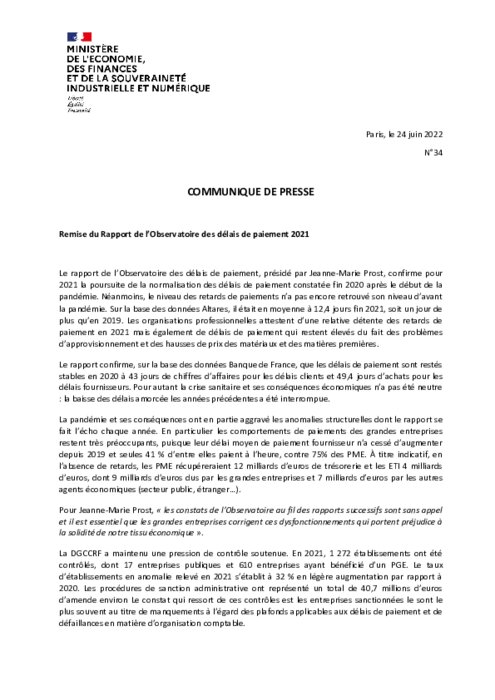 Remise du Rapport de l’Observatoire des délais de paiement 2021