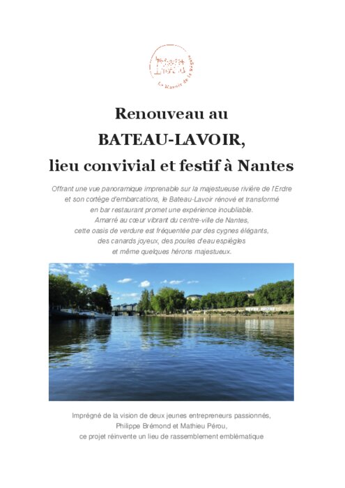 Offrant une vue panoramique imprenable sur la majestueuse rivière de l’Erdre et son cortège d’embarcations, le Bateau-Lavoir rénové et transformé en bar restaurant promet une expérience inoubliable. Amarré au cœur vibrant du centre-ville de Nantes, cette oasis de verdure est fréquentée par des cygnes élégants, des canards joyeux, des poules d’eau espiègles et même quelques hérons majestueux.