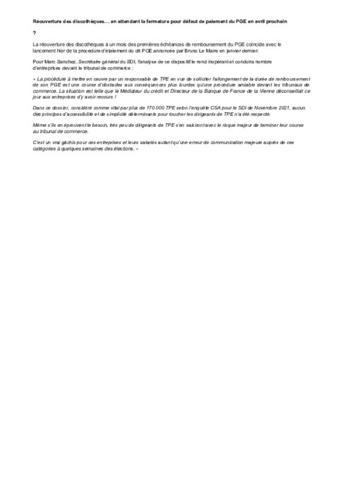 Métiers 16 février 2022 - 17:16 La réouverture des discothèques à un mois des premières échéances de remboursement du PGE coïncide avec le lancement hier de la procédure d’étalement du dit PGE annoncée par Bruno Le Maire en janvier dernier. PDF (114 Ko) Télécharger