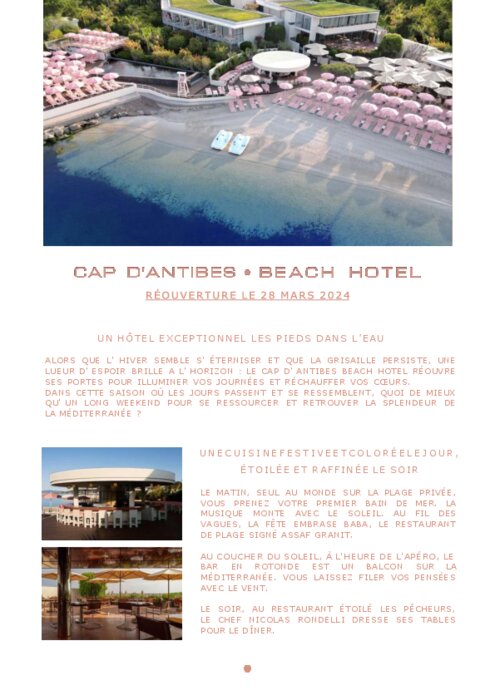 Restauration commerciale 25 mars 2024 - 10:41 Alors que l'hiver semble s'éterniser et que la grisaille persiste, une lueur d'espoir brille à l'horizon, le Cap d'Antibes Beach Hôtel va illuminer les journée et les coeurs. PDF (277 Ko) Télécharger