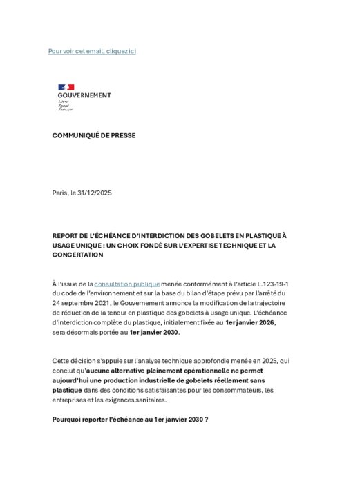 À l’issue de la consultation publique menée conformément à l’article L.123-19-1 du code de l’environnement et sur la base du bilan d’étape prévu par l’arrêté du 24 septembre 2021, le Gouvernement annonce la modification de la trajectoire de réduction de la teneur en plastique des gobelets à usage unique. L’échéance d’interdiction complète du plastique, initialement fixée au 1er janvier 2026, sera désormais portée au 1er janvier 2030.