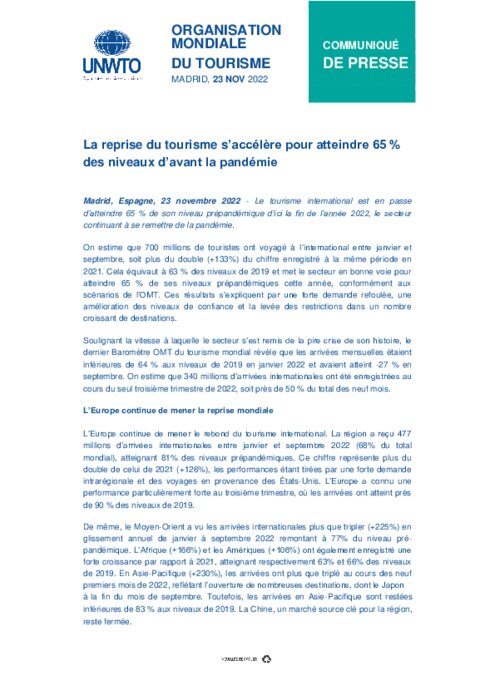 Métiers 23 novembre 2022 - 09:11 Le tourisme international est en passe d'atteindre 65 % de son niveau prépandémique d'ici la fin de l'année 2022, le secteur continuant à se remettre de la pandémie. PDF (159 Ko) Télécharger