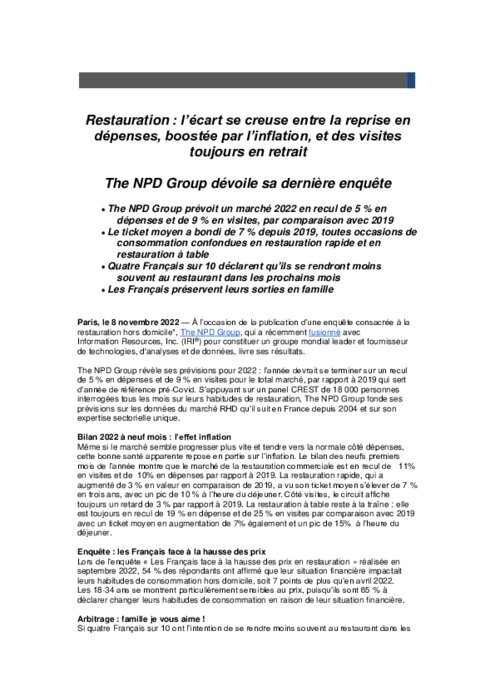 A l’occasion de la publication d’une enquête consacrée à la restauration hors domicile, The NPD Group, qui a récemment fusionné avec Information Resources, Inc. (IRI) pour constituer un groupe mondial leader et fournisseur de technologies, d'analyses et de données, livre ses résultats.