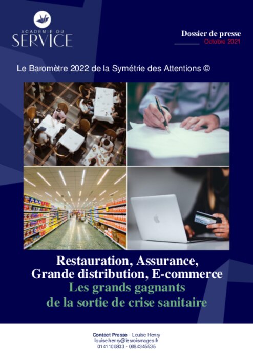 L’Académie du Service publie pour la huitième année consécutive son Baromètre national de la Symétrie des Attentions. Ce diagnostic complet de la culture de service dans l’entreprise montre que 4 secteurs économiques – la Restauration, l’Assurance, la Grande Distribution et le E-commerce - sont les grands gagnants de la sortie de crise sanitaire.