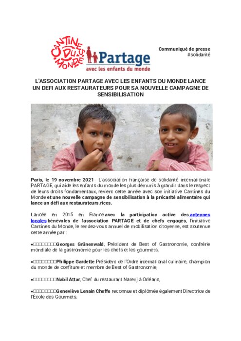 L'association française de solidarité internationale PARTAGE, qui aide les enfants du monde les plus démunis à grandir dans le respect de leurs droits fondamentaux, revient cette année avec son initiative Cantines du Monde et une nouvelle campagne de sensibilisation à la précarité alimentaire qui lance un défi aux restaurateurs.rices.