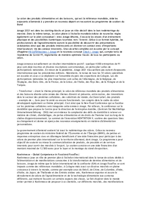 Métiers 24 août 2021 - 09:59 Le salon des produits alimentaires et des boissons, qui est la référence mondiale, aide les exposants allemands à y prendre un nouveau départ en recourant au programme de soutien du Bund PDF (93 Ko) Télécharger