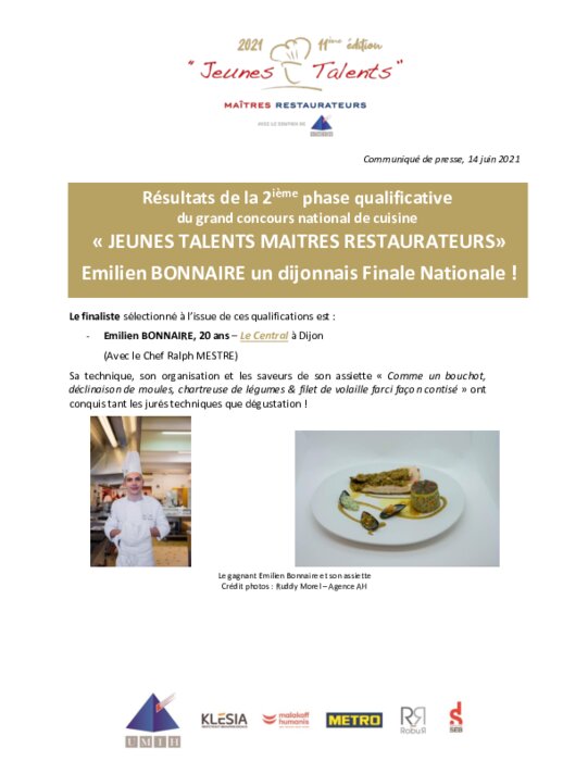 Ce lundi 14 juin 2021, lors de la 11ème édition du Concours « Jeunes Talents » des Maîtres Restaurateurs, 5 jeunes cuisiniers se sont affrontés à Dijon, dans les locaux de l’Ecole des Métiers Dijon Métropole, avec pour objectif de gagner leur place en finale nationale.