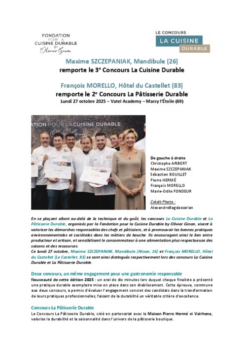 En se plaçant allant au-delà de la technique et du goût, les concours La Cuisine Durable et La Pâtisserie Durable, organisés par la Fondation pour la Cuisine Durable by Olivier Ginon, visent à valoriser les démarches responsables des chefs et pâtissiers, et à promouvoir les bonnes pratiques environnementales et sociétales dans les métiers de bouche. Ils encouragent ainsi le lien entre producteur et artisan, et sensibilisent le consommateur à une alimentation plus respectueuse des saisons et des ressources.