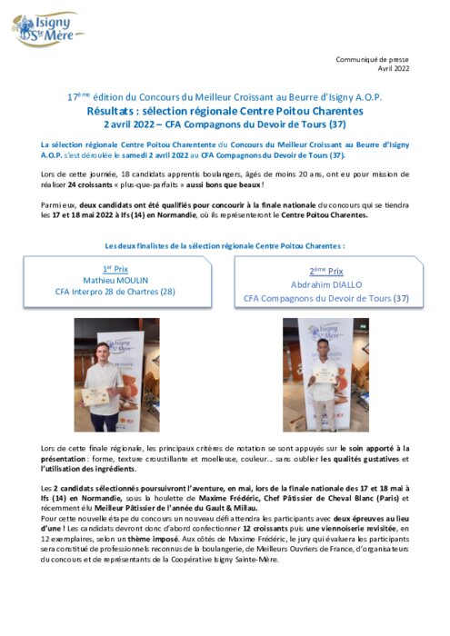 La sélection régionale Centre Poitou Charentes du Concours du Meilleur Croissant au Beurre d’Isigny A.O.P. s’est déroulée le samedi 2 avril 2022 au CFA Compagnons du Devoir de Tours (37). Lors de cette journée, 18 candidats apprentis boulangers, âgés de moins 20 ans, ont eu pour mission de réaliser 24 croissants « plus-que-parfaits » aussi bons que beaux.