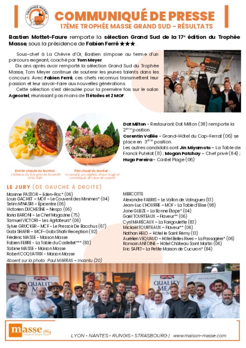 Bastien Mottet-Faure remporte la sélection Grand Sud de la 17ᵉ édition du Trophée Masse, sous la présidence de Fabien Ferré. Sous-chef à La Chèvre d’Or, Bastien s’impose au terme d’un parcours exigeant, coaché par Tom Meyer. Dix ans après avoir remporté la sélection Grand Sud du Trophée Masse, Tom Meyer continue de soutenir les jeunes talents dans les concours. Avec Fabien Ferré, ces chefs reconnus transmettent leur passion et leur savoir-faire aux nouvelles générations. Cette sélection s’est déroulée pour la première fois sur le salon Agecotel, réunissant pas moins de 11 étoiles et 2 MOF.