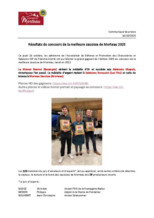 Métiers 17 octobre 2025 - 10:09 Le jeudi 16 octobre, les adhérents de l’Association de Défense et Promotion des Charcuteries et Salaisons IGP de Franche-Comté ont pu féliciter le grand gagnant de l’édition 2025 du concours de la meilleure saucisse de Morteau, lancé en 2012. PDF (1 Mo) Télécharger