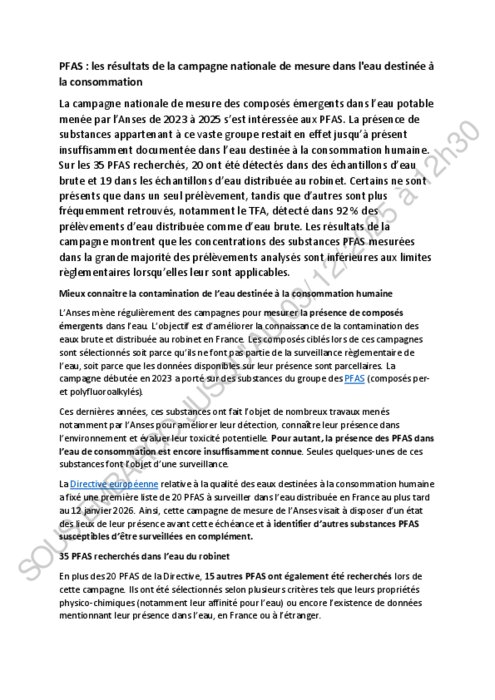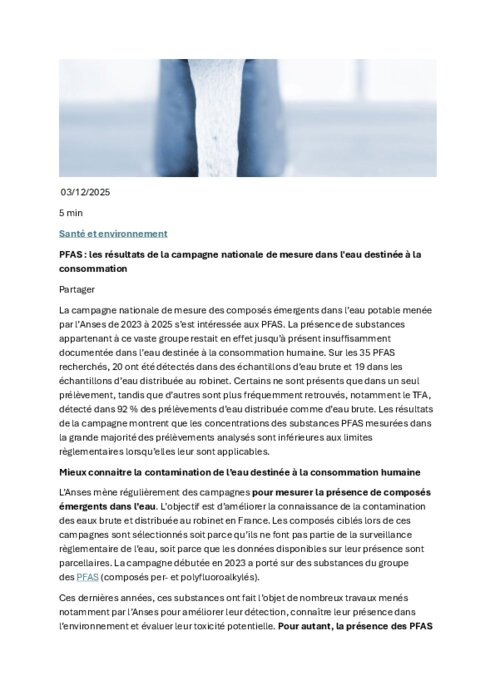 La campagne nationale de mesure des composés émergents dans l’eau potable menée par l’Anses de 2023 à 2025 s’est intéressée aux PFAS. La présence de substances appartenant à ce vaste groupe restait en effet jusqu’à présent insuffisamment documentée dans l’eau destinée à la consommation humaine.