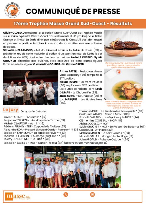 Les candidats avaient deux sujets à réaliser en quatre heures : l'alliance du foie gras et de la vanille en entrée et le canard gras et le choux rouge ou vert en plat. Olivier Cloteau, chef exécutif des restaurants du Puy Tilleul, de la Petite Grange et l’Hôtel La Borie d’Hélipse, situés dans le Cantal, s’est démarqué en prenant le parti de terminer la cuisson de sa recette dans une cabosse de cacao.