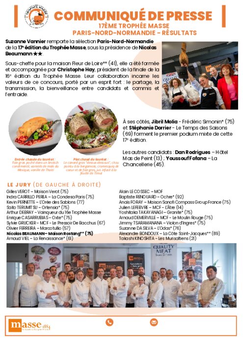 Depuis plus de 35 ans, le Trophée Masse révèle des talents, accompagne de belles histoires culinaires, et témoigne de l’évolution des goûts et des modes. Concours exigeant, reconnu par la profession, il récompense autant la maîtrise technique que l’audace créative.