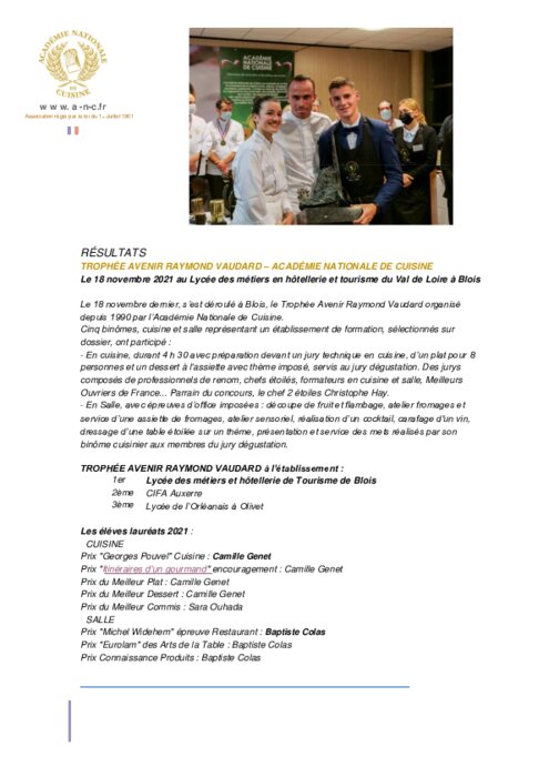 Métiers 26 novembre 2021 - 23:02 Cinq binômes, cuisine et salle représentant un établissement de formation, sélectionnés sur dossier. PDF (172 Ko) Télécharger